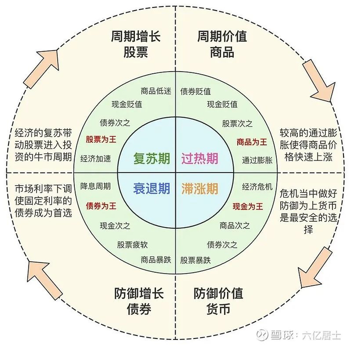 上图即是大名鼎鼎的美林时钟,美林时钟把经济活动分为了衰退期、复苏期、过热期和滞胀期。