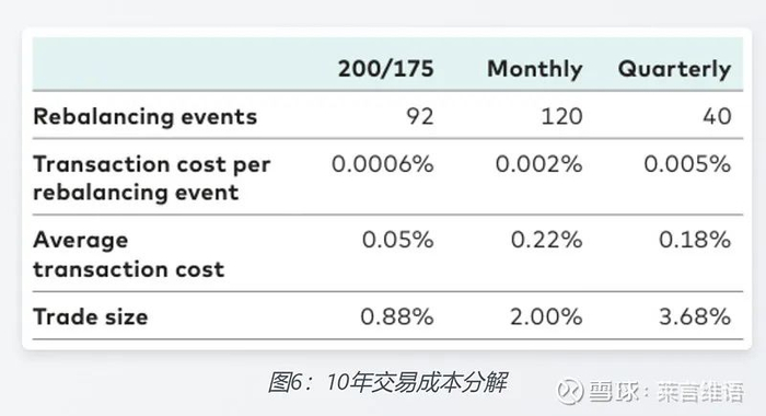 总结一下,通过对比分析,我们可以看到,相比于传统的月度或季度再平衡,200/175阈值再平衡策略,确实能带来实实在在的好处:更高的年化回报,更小的资产配置偏差,以及显著降低的交易成本。