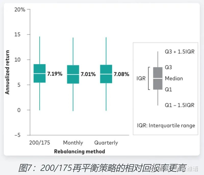 交易成本降低了,那最终的回报如何呢?下图是不同策略下投资组合的年化回报率,中位数也就是中间那条线代表了最典型的情况,200/175策略的中位数回报率相较月度和季度再平衡都高。