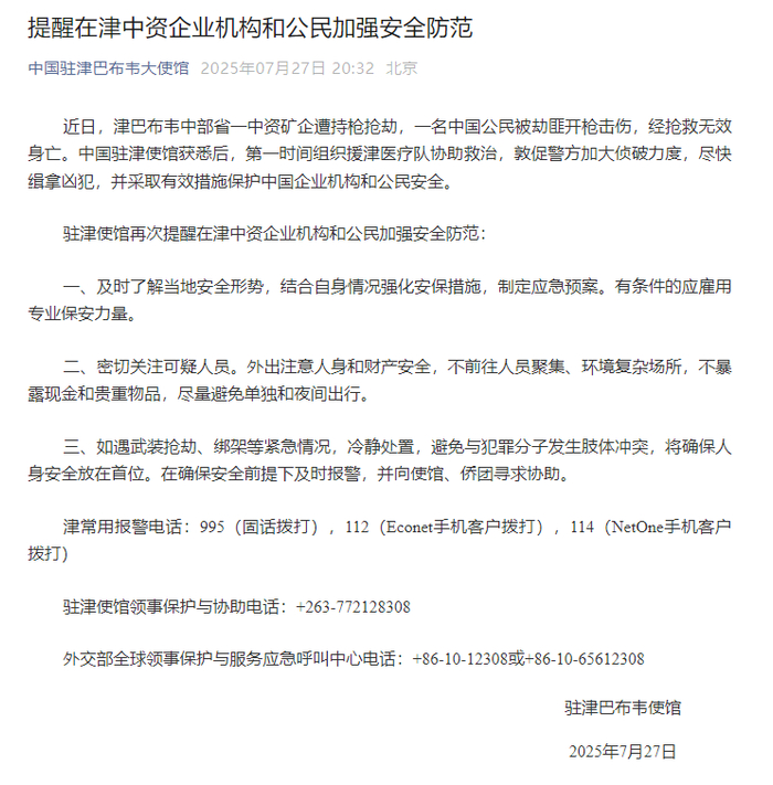 7月27日, 中国驻津巴布韦大使馆提醒在津中资企业机构和公民加强安全防范,全文如下: