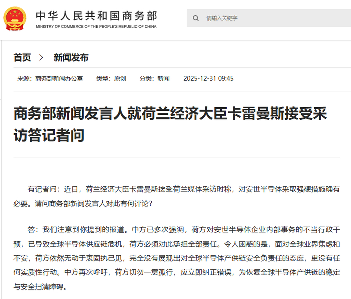 有记者问:近日,荷兰经济大臣卡雷曼斯接受荷兰媒体采访时称,对安世半导体采取强硬措施确有必要。请问商务部新闻发言人对此有何评论?