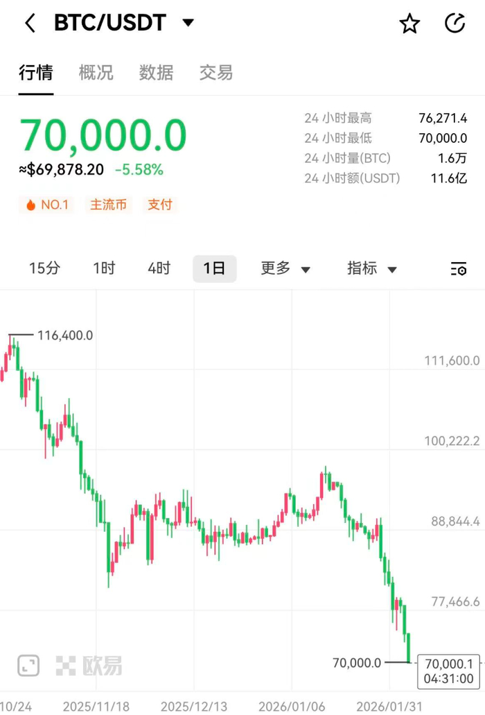 2月5日电,比特币自2024年11月6日以来首次跌破70,000美元关口。