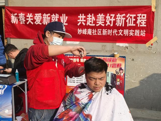 除了实用的慰问物资,妙峰庵社区还精准对接快递小哥的日常需求,联动多方资源搭建便民服务平台。移动公司的工作人员现场为小哥们提供免费手机贴膜服务,细心讲解流量套餐优惠政策,并赠送专属流量包,解决他们户外工作通讯需求;爱心理发师则带着工具忙碌起来,根据大家的需求修剪发型,让常年忙碌的小哥们以清爽利落的形象迎接新春。