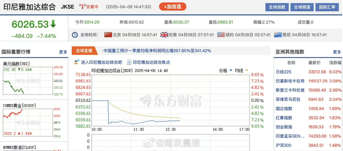 【#东南亚股市崩跌#】4月8日,东南亚股指普遍暴跌。越南股指VN指数跌幅扩大至6%,自4月2日收盘以来累计跌超12%。越南盾兑美元亦跌至历史新低。与此同时,印尼股指暴跌超7%,泰国股指暴跌超4%。