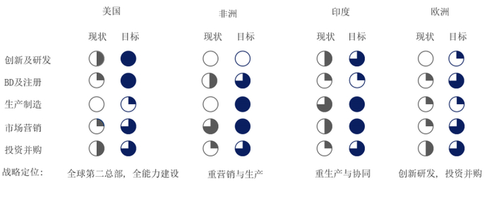 复星医药一直走国际化路线,且从营收来看颇具成效。中报显示,2021年上半年在中国大陆以外地区和其他国家实现营业收入51.98亿元,占整体收入30.66%。目前公司在境外市场的创新研发主要集中在美国和印度;BD主要在非洲市场;生产制造绝大部分放在印度、小部分放在欧洲;市场营销在美国、非洲、印度、欧洲均有分布,重点在非洲和印度;投资并购主要集中在美国和欧洲。