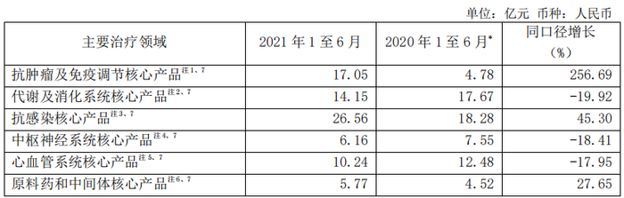 报告期内,抗肿瘤及免疫调节核心产品同比增长256.69%,为史上最大增速,其中由汉利康(利妥昔单抗)贡献了42.46%。公司抗肿瘤及免疫调节药物的毛利率较去年同期增加3.48个百分点,同样由于以上三大品种等新品销售放量所致。此外,抗感染核心产品同比增长45.30%,主要由mRNA新冠疫苗复必泰上半年实现收入5亿多元所贡献。