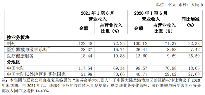 中报显示,报告期内医疗器械与医学诊断业务实现营业收入28.37亿元,同比增长7.42%,在三大业务板块中同比增速最低,主要原因在于集团与直观复星签署的“达芬奇手术机器人”于中国大陆及港澳地区的经销权转让协议于2020年末到期,自2021年起,该部分业务的收益转入直观复星。