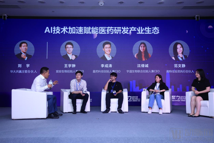 “AI技术如何加速赋能医药研发产业生态”的圆桌讨论热烈。华大共赢主管合伙人刘宇,宸安生物创始人兼CEO王宇翀,星药科技创始人兼CEO李成涛,宇道生物联合创始人兼CEO沈倩诚,高特佳投资执行合伙人范文静等嘉宾围绕AI技术在药物研发的诸多环节,比如寻找药物的治疗和毒性效应曲线,预测药物的结构、生物活性和作用方式,选择临床试验人群等,进行了思想碰撞。