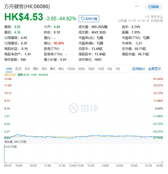 最终方舟健客以4.53港元/股收盘,跌幅44.62%,总市值约61亿港元。当日股份成交量989.2万股,成交额4641.58万股。