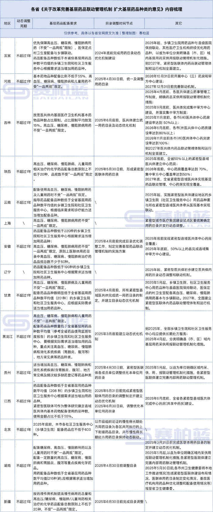 部分省份将目录调整时限定在了5月底或6月底。例如,陕西要求2025年5月30日前形成紧密型医联体用药目录,吉林要求2025年6月底前,医共体建立统一用药目录及动态优化机制等。