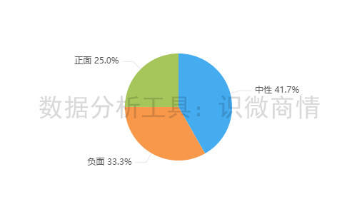 该时段内,有关“丝芭传媒鞠婧祎互诉事件”的舆情情感倾向以中性为主,占41.7%;其次为负面舆情,占33.3%。正面舆情较少,占25.0%。