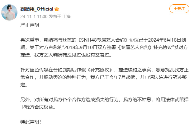 一个小时后,“鞠婧祎_Official”也发布严正声明回应,鞠婧祎与丝芭的《SNH48专属艺人合约》协议已于2024年6月18日到期,所谓“补充协议”系对方捏造,并已在7月起诉,申请法院进行笔迹鉴定。