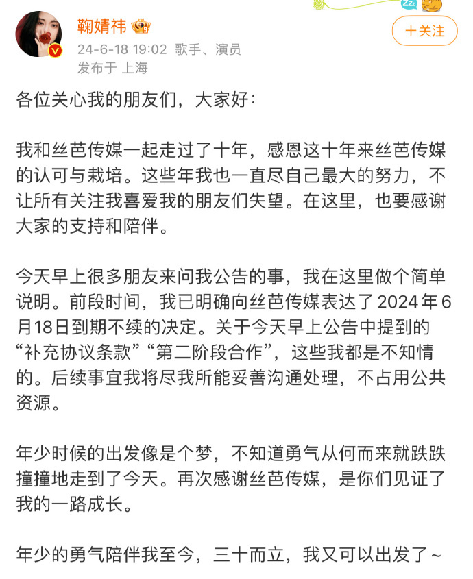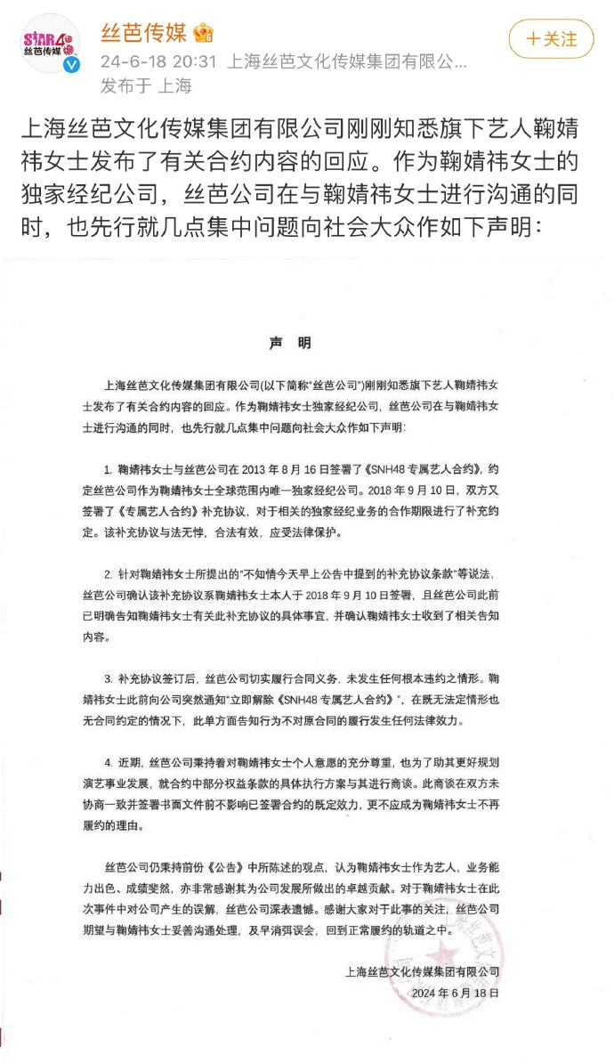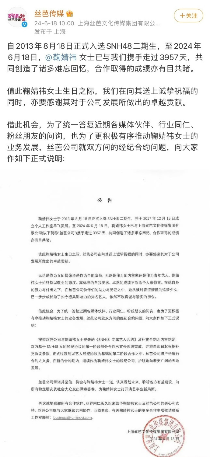 6月18日,丝芭发布声明称和鞠婧祎的第一阶段部分合作完成,根据补充协议将过渡到第二阶段合作之中。