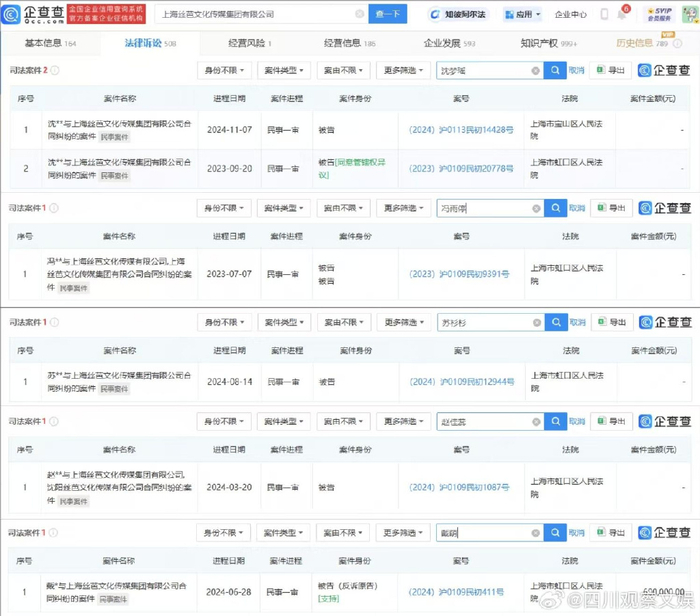 根据公开的工商信息显示,上海丝芭文化传媒集团有限公司成立于2010年5月,法定代表人为王靖,注册资本约8927万人民币,由王靖、上海星澈创业投资合伙企业(有限合伙)等共同持股。该公司涉及多个法律诉讼案件,案由多为不正当竞争纠纷、合同纠纷等。此外,丝芭传媒与多位SNH48原成员存在合同纠纷诉讼,涉及的成员包括张怡、金莹玥、杨惠婷、冯薪朵、林忆宁等。