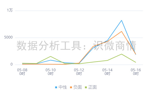 通过观察趋势可知,该时段内,有关“盒马鸡蛋猕猴桃抽检成分超标事件”的中性舆情于05月15日达到最高峰,负面舆情于05月15日达到最高峰,正面舆情于05月15日达到最高峰。