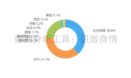 该时段内,有关“盒马鸡蛋猕猴桃抽检成分超标事件”的舆情主要集中在社交网络平台,相关舆情量约占总量的38.8%,其次为新闻APP(约占37.1%),短视频(约占19.5%)。
