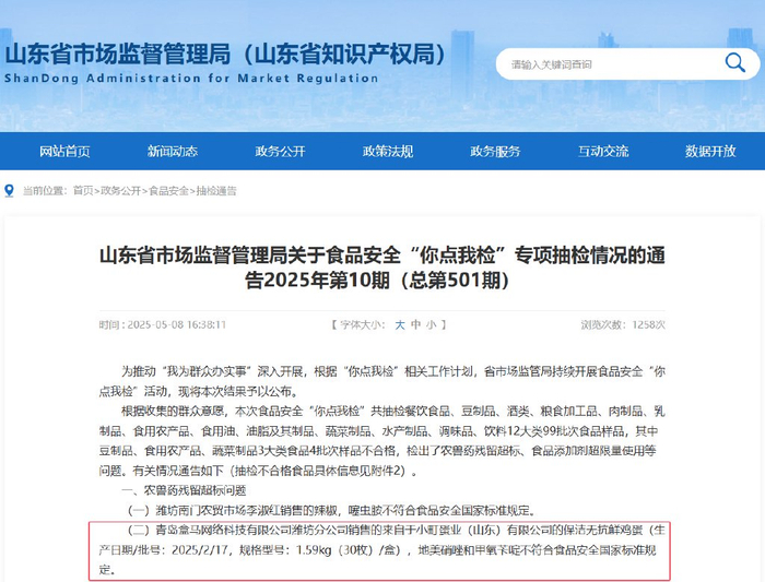 2025年5月8日,山东省市场监督管理局公布的食品安全“你点我检”专项抽检情况通报显示,在农兽药残留超标问题项目中,青岛盒马网络科技有限公司潍坊分公司销售的来自于小町蛋业(山东)有限公司的保洁无抗鲜鸡蛋(生产日期/批号:2025/2/17,规格型号:1.59kg(30枚)/盒),地美硝唑和甲氧苄啶不符合食品安全国家标准规定。