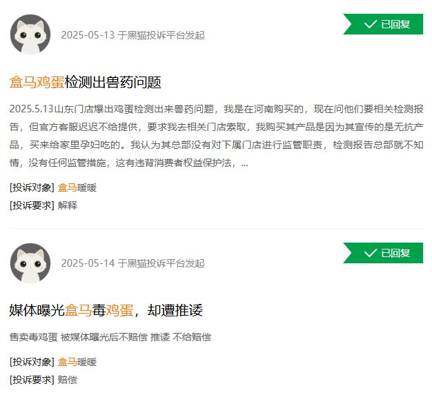 根据黑猫平台显示,有多位消费者购买该款鸡蛋申请退款遭到拒绝,盒马客服称“购买商品不涉及抽检批次”。对此,消费者并不认同,认为该款鸡蛋存在食品安全隐患,应该全部退款。