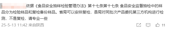 但有网友指出,“依据《食品安全抽样检验管理办法》第十七条第十七条 食品安全监督抽检中的样品分为检验样品和复检备份样品。省局可以安排复检,县局对同批次产品委托第三方机构进行检测,不是复检,请专业一些”。