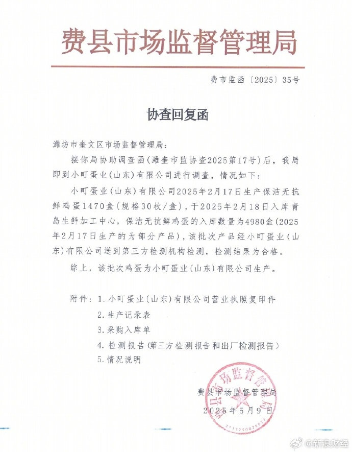 5月9日,供应商小町蛋业回应,2月20日,山东省市场监督管理局对盒马潍坊店产品开展抽检,上述鸡蛋产品在抽检范围内。监管部门随后向盒马邮寄抽样结果通知书,告知检测不合格,并要求盒马在七日内回应并提交复检申请。然而,由于盒马潍坊店系新开门店,日常人流量大、业务繁忙,且负责人经验不足,未能在规定期限内提交复检申请,致使5月8日山东省市场监督管理局系统中显示该批次产品不合格。