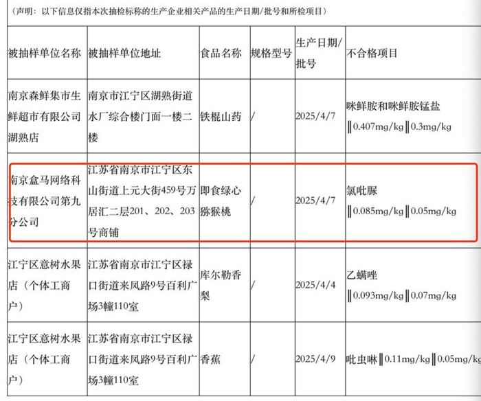 2025年5月13日,南京市江宁区市场监督管理局发布食品安全抽检公告,显示南京盒马网络科技有限公司第九分公司销售的即食绿心猕猴桃(生产日期:2025年4月7日)被检出氯吡脲(俗称膨大剂,过度食用可能导致人体中毒、致癌、损伤肝脏和神经系统等)含量超标,检测值为0.085mg/kg,超出国家标准0.05mg/kg的限值。