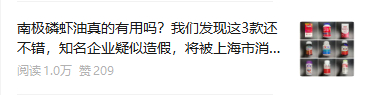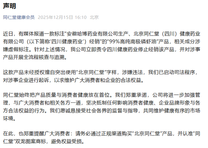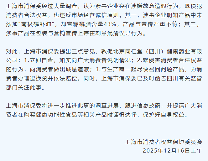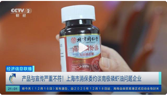 2025年12月11日,上海市消保委通过官方微信公众号发布《南极磷虾油真的有用吗?我们发现这3款还不错,知名企业疑似造假,将被上海市消保委约谈|消保委亲测》一文,公布对市场上15款南极磷虾油产品的检测结果。其中,一款标称“北京同仁堂99%高纯南极磷虾油”的产品,宣称磷脂含量43%,实测结果却为0,引发轩然大波。