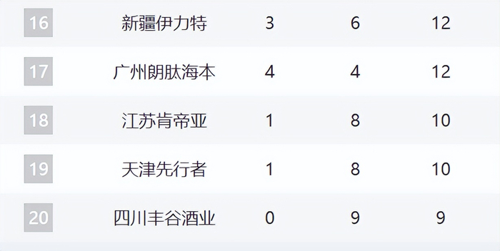 最后五名分别是新疆、广州、江苏、天津和四川。广州这轮拿下山西是惊喜,他们还少赛一场,也是4胜。新疆目前的麻烦还非常大,外援和主帅的实力都非常糟糕。江苏、天津和四川巩固最后三名,基本上没什么希望了。