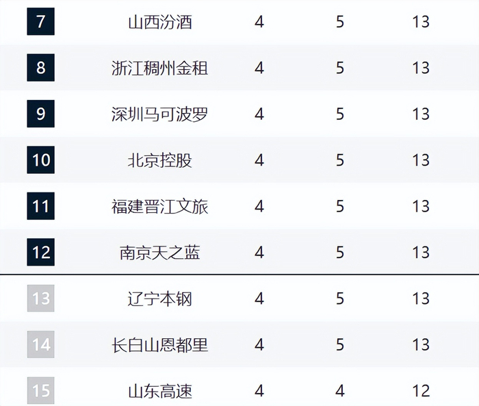 7-15全部都是4胜,球队分别是山西、浙江、深圳、北控、福建、同曦、辽宁、吉林和山西。现在山西遭遇四连败,球队的情况越来越糟糕,攻守全部都崩盘,排名暴跌。浙江换帅之后已经三连胜了,越来越强悍了。深圳这轮则惜败给了北控,他们分别排在了第九和第十。而福建连续拿下吉林和福建,巩固前十二的位置。同曦这轮则击败了吉林。
