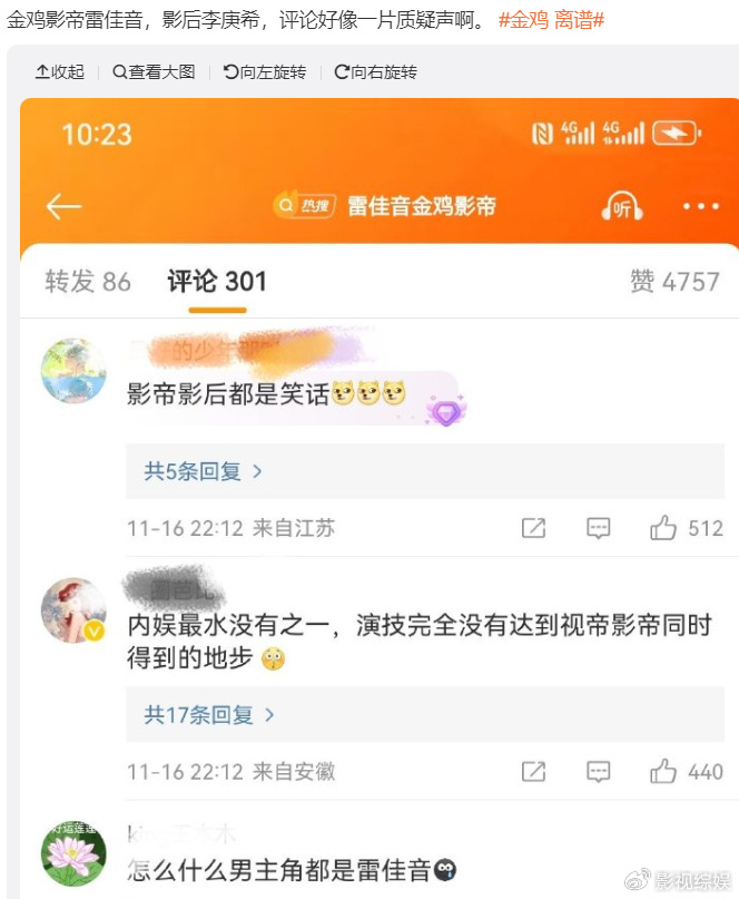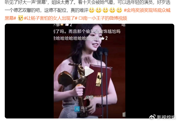 所以当李庚希从刘德华手中接过压轴的金鸡影后奖杯时,现场就有观众吐槽喊黑幕,随后网上也出现了很多质疑奖项和李庚希演技的舆论。