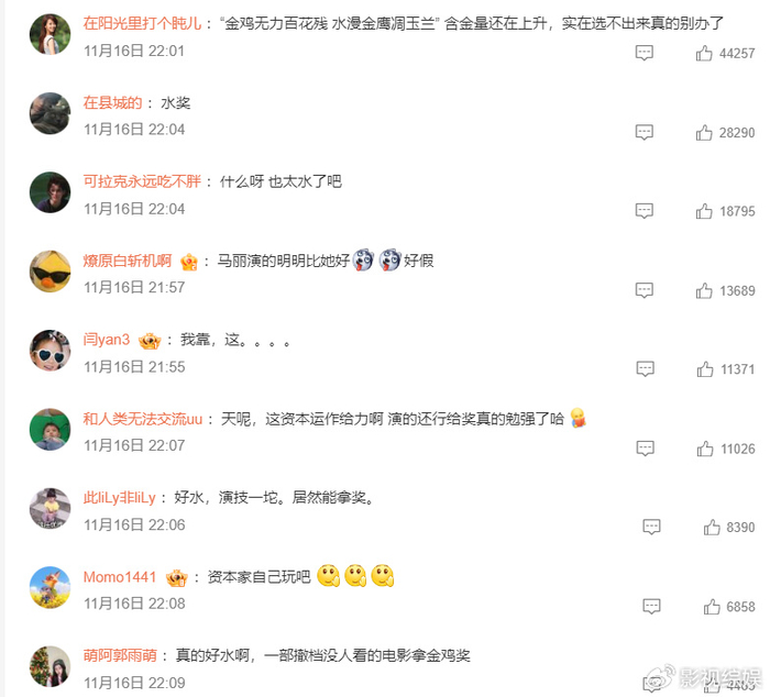 就算是一些专业的影视奖项,虽然还站在业界权威专业的高端,但质疑也与日俱增,被吐槽提名有限,奖项分布太水的声音越来越大。这种声音,越是在受关注的权威奖项,越是强烈。比如之前的电视剧白玉兰奖、飞天奖和金鹰奖,都因为提名和获奖被质疑惹出不少风波。而刚刚闭幕的电影金鸡奖,也不例外。