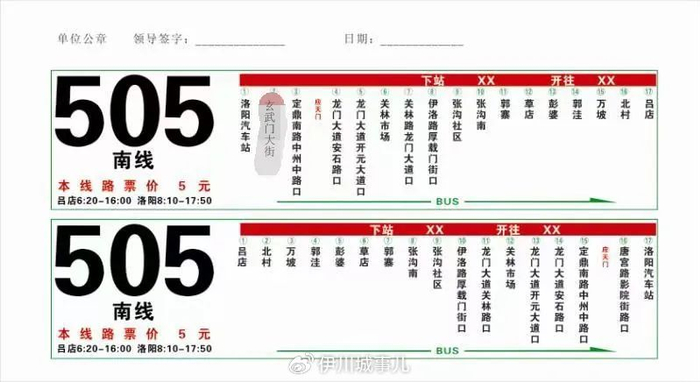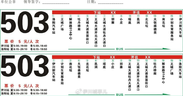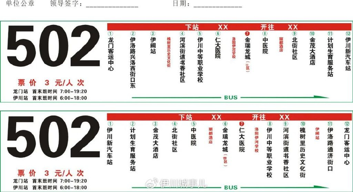 伊川至洛阳501/502/503/505班车发车时间及线路图。