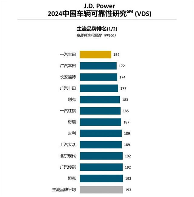 优秀的产品品质,自然也能得到权威机构的认可。在J.D. Power 2024年“中国车辆可靠性研究”中,一汽丰田拿下主流品牌及多个细分市场可靠性第一,坐实了其产品的高品质、高可靠性口碑。