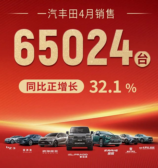 继今年一季度以销量超过17.2万辆,实现同比增长9.6%之后,一汽丰田4月再创新高,销售新车65024辆,同比大增32%。其中,电动化车型占比54%,高端车型占比60%。