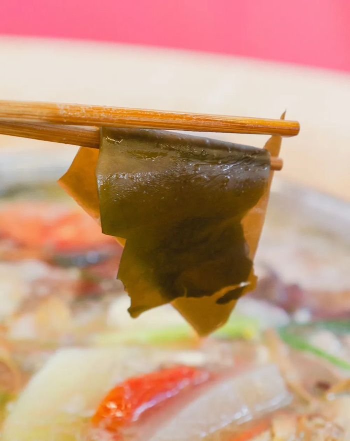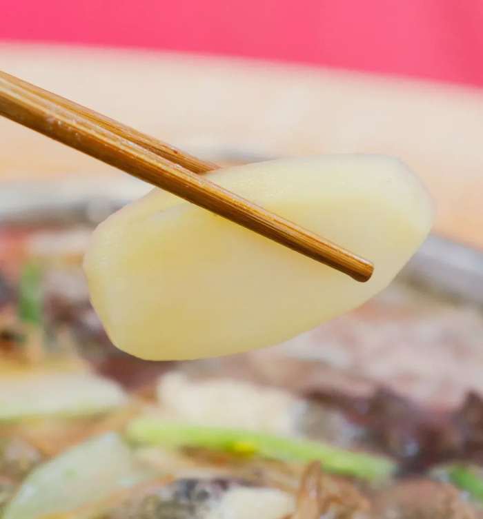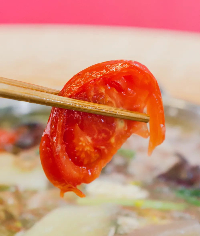 素菜下锅时都还是生的,所以一定要留到最后再吃。番茄香甜翻沙、海带香糯嫩滑、土豆软烂可口……在锅里沸腾洗礼后,这些普普通通的素菜都变得无比美味。