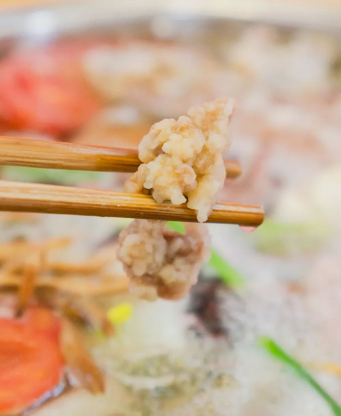 也不知道是谁发明的把酥肉煮到火锅里面吃,酥肉肥瘦相间,嚼劲十足,跟新鲜油炸出锅相比又有一种不同的诱人风味。