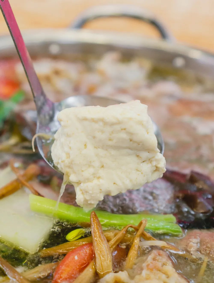 荤豆花的主角当然是豆花了,这个白白嫩嫩的东西简直比锅里的那些肉还要受欢迎,稍不留神就被舀完了。