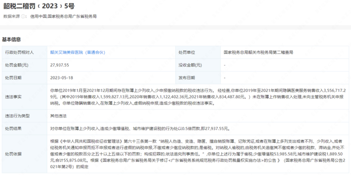 企查查数据的处罚决定书《韶税二稽罚﹝2023﹞5号》显示,2023年5月18日,韶关艾瑞美容医院(普通合伙)(以下简称“艾瑞美容”)因2019年1月—2021年12月期间存在隐瞒医美服务销售收入355.67万元,(其中2019年销售收入159.98万元,2020年销售收入112.24万元,2021年销售收入83.45万元),被国家税务总局韶关市税务局第二稽查局认定存在隐瞒销售收入,在账簿上少列收入,虚假纳税申报,造成少缴税款的税收违法事实。
