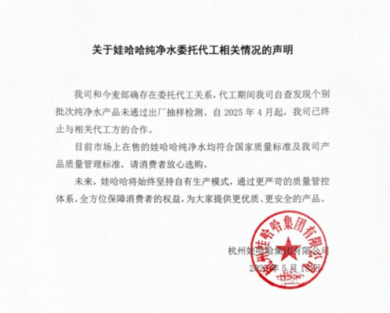 或是因为登上了微博热搜,娃哈哈还发布声明称,我司和今麦郎确存在委托代工关系,代工期间我司自查发现个别批次纯净水未通过出厂抽样检测,自2025年4月起,我司已终止与相关代工方的合作。目前市场上在售的娃哈哈纯净水均符合国家质量标准及我司质量管理标准,请消费者放心选购。