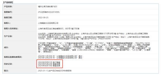 值得关注的是,清扬君发现“橘朵云柔无痕粉霜 N20”的最新备案日期为2025年6月10日,并非药监局网站问题,而是橘宜集团连夜上传了相关功效数据。