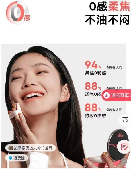 事实上也并非橘宜集团所说的那样。如橘朵防晒粉饼01,在抖音橘朵旗舰店宣传“94%消费者认同柔焦0粉感;88%消费者认同 透气0闷;88%消费者认同 持妆0油感”、“热汗亦持妆,暴晒也漂亮”等。