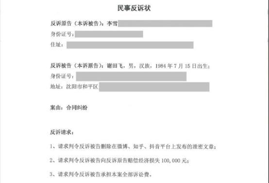 针对谢某某的微博爆料,李雪琴则反诉对方要求删除微博、知乎、抖音平台发布的泄密文章。