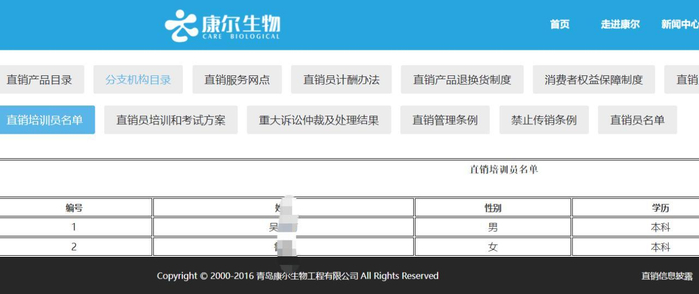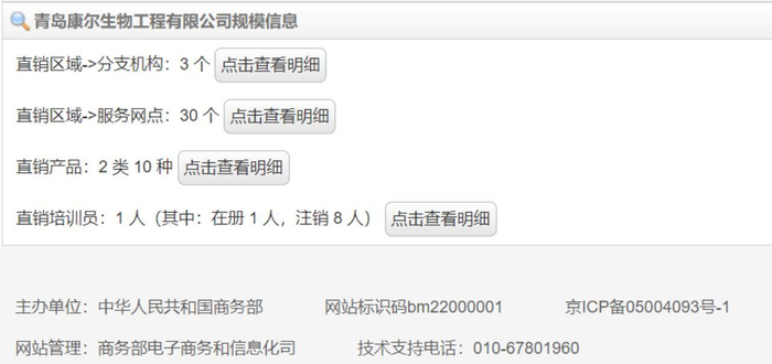 值得注意的是,康尔生物持有商务部颁发的直销许可证,获批直销区域仅限青岛、广州等地共30个服务网点,直销产品为2类10种,还有1个直销培训员(在册1个,注销8个)。而康尔生物官网显示有2个直销培训员。清扬君猜测,康尔生物或许是因事务繁忙而未及时更新网站,但这在一定程度上也反映出其在管理能力上的不足。