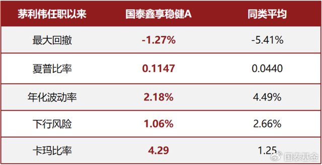 以其在管的代表产品国泰鑫享稳健A为例,作为一只股债搭配的固收+产品,自茅利伟接手以来,该产品的区间最大回撤仅1.27%,远低于同期同类产品5.41%的平均最大回撤数据,且夏普比率、卡玛比率等风险指标同样表现出色,真正做到了在市场波动时让持有人尽可能少的产生颠簸感。