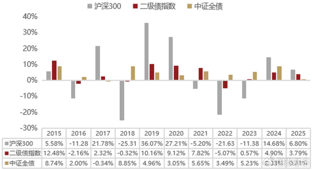 不仅波动小,二级债基指数在2016、2018年等沪深300指数表现为负的阶段也表现出较强抗跌能力。如果对比中证全债指数会发现,二级债基指数在股市上涨时的收益弹性也不容小觑,尤其在2019-2021年以及2025年以来均有十分亮眼的表现。
