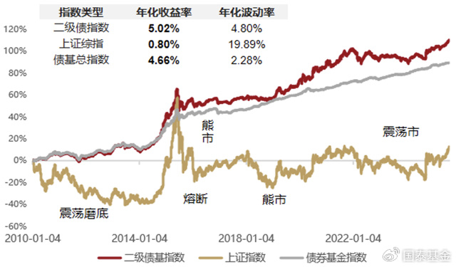 从历史表现来看,以二级债基为代表的固收+产品成为穿越市场颠簸的“利器”。过去十年二级债基指数走势相对上证指数波动更小,持有体验更佳。