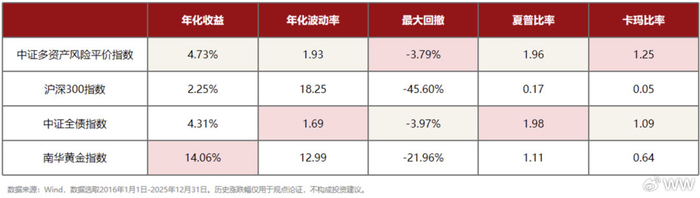 以代表多资产配置的中证多资产风险平价指数为例,该指数由A股、债券、黄金三类核心资产构成,从指数近10年表现来看,最大回撤仅为-3.97%,不仅显著低于中证全债指数代表的债券类资产,更大幅优于沪深300指数代表的权益资产、南华黄金指数代表的商品资产,展现出极强的抗风险能力。