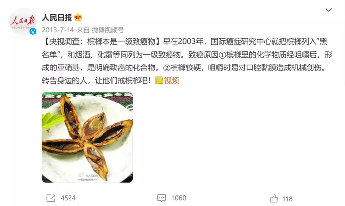 早在2003年,国际癌症研究中心就把槟榔列入“黑名单”,为一级致癌物。