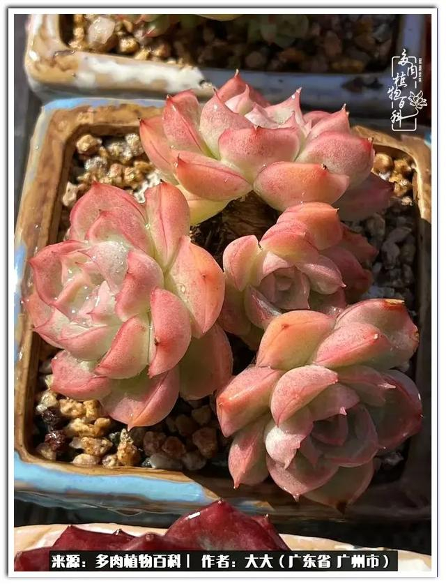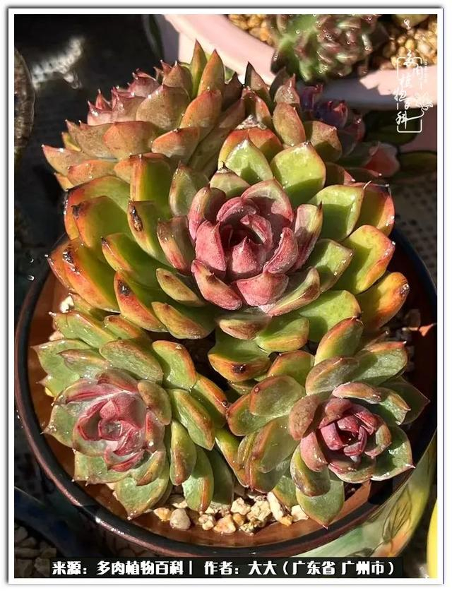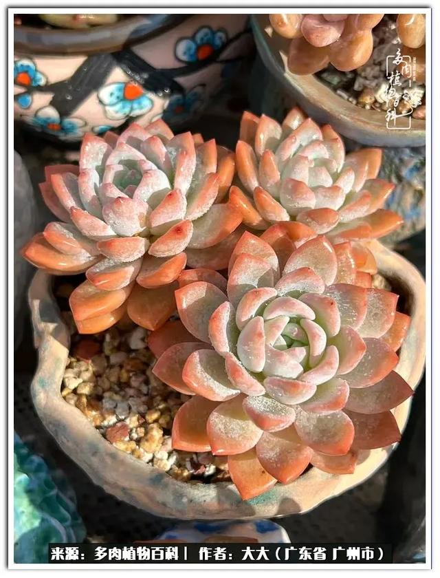 这两年好火的茶系,不知道什么茶,价炒得上天了。这三个是前年买的,同品种一起买的这三只,一个橘色系,一个粉色系的,还有一个又橘又粉,你就说多肉存不存在基因呢?