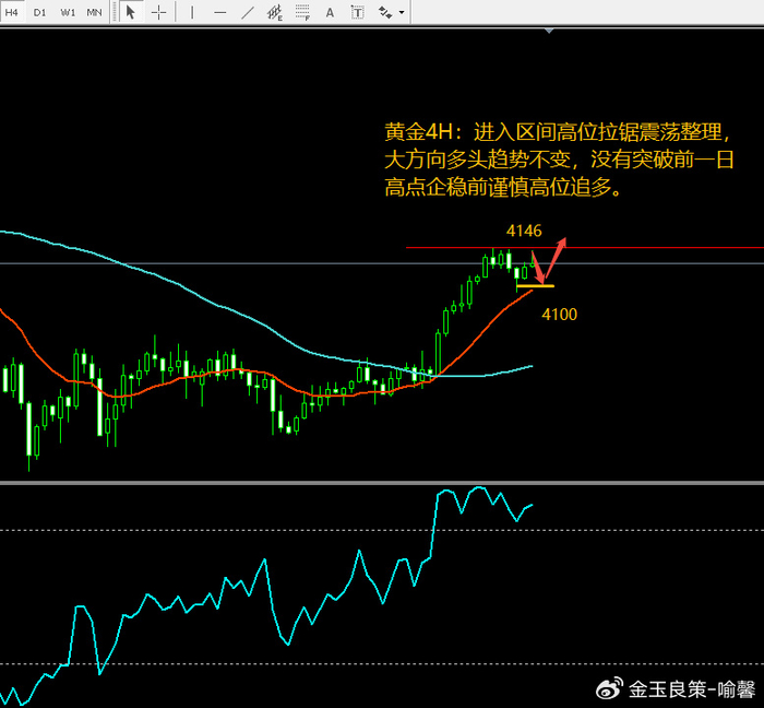 昨日国际金价日线收取十字星,最高大涨到4148,最低4096,收盘于4127,昨日黄金白天布局做多顺利上涨,晚上没有突破4150高点尾盘做空下跌利润结束,从整个技术形态来看,毋庸置疑多头趋势方向明朗,如若出现大幅调整也一定是继续给做多上车抄底机会,依然继续看好4200美元上方突破,短期只是时间的问题,大方向不会改变;昨晚凌晨金价大跌破4100快速反弹到早盘回到了原点高点价格,说明金价多头占优依然处于强势节奏,特别是周一大涨突破站稳4030美元后结束2周盘整进入单边走势;