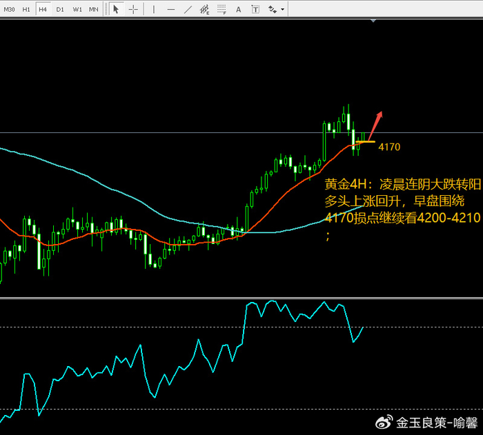 昨日周四黄金冲顶高点结束本周,白天做多上涨,晚上破4220美元后反弹反复做空顺利下跌,凌晨低点4145,目前短线4小时形态来看,金价开始回稳继续反弹上涨,早盘起涨点低点再4170,如若选择做一波反弹多单,稳健围绕4170损点,确认进场价格做多上涨4200美元上方即可;